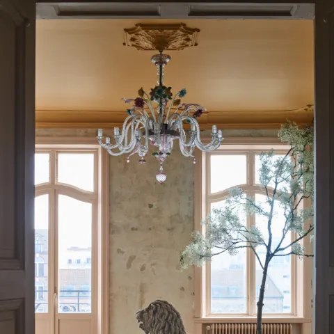 Pompøse Murano-lysekroner møter gamle bondeskap i gangen med de rå betongveggene som har det gylne Gold in Ghana i taket og rosabeige Powder in Pisa på tredetaljene.