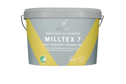 Milltex 7 Matt er en matt vegg- og takmaling for maling innendørs på underlag av puss, betong, gipsplater, trefiberplater, overmalbar tapet og glassfiber strie/duk. Den ferdige overflaten tåler å tørkes forsiktig av med en klut. Milltex 7 Matt er spesielt utviklet for den profesjonelle maleren.